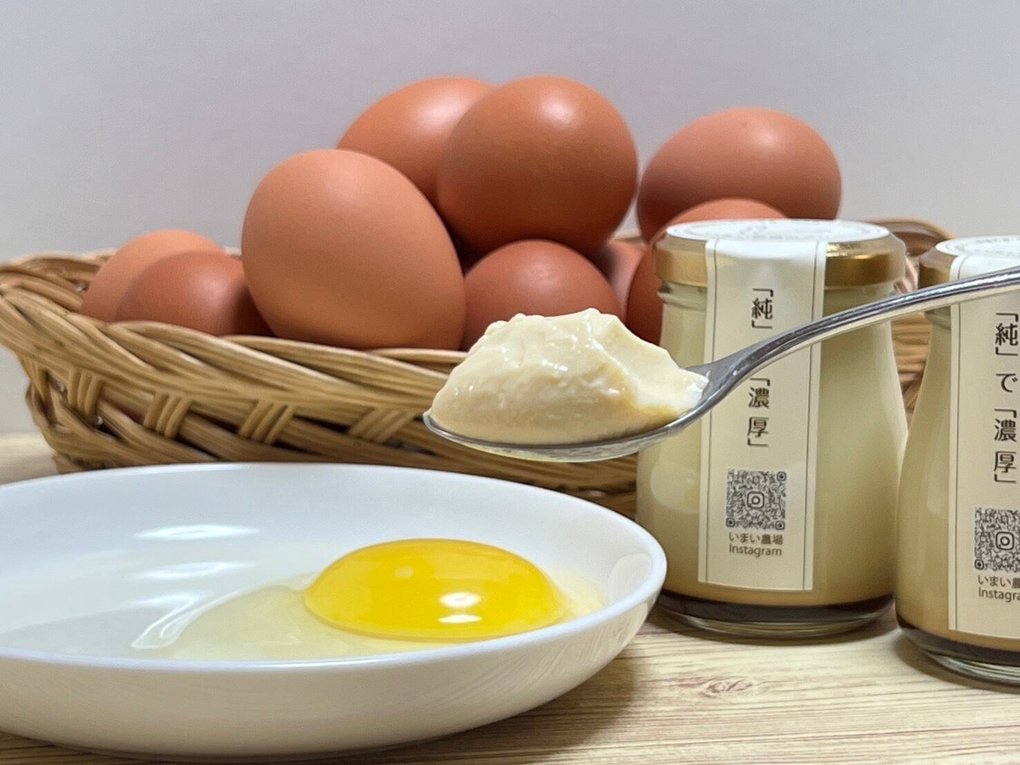 生まれたての初生ビナから、兵庫県産米を中心とした手作り発酵飼料を与え、飲み水は名水百選の千種川源流を掛け流し、四面開放鶏舎、のびのび平飼い、、等々、鶏と真剣に向き合い、生涯無投薬で大切に育てた、いまい農場の平飼い有精卵をたっぷり使用したプリンです。卵以外の原材料は、低温殺菌牛乳・純生クリーム・てんさい糖・ビートグラニュー糖と、いわゆる「普通のプリン」ですが、卵が違うと、プリンも違います。臭みがないので香料等添加物一切不使用。農場が直に作ることで実現した「純」で「濃厚」なプリンをどうぞご賞味ください。